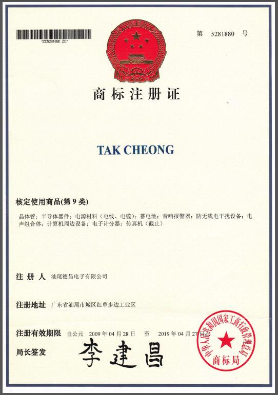 首頁(yè) >> 關(guān)于德昌 >> 商標(biāo)聲明 >> TAK CHEONG(正體)